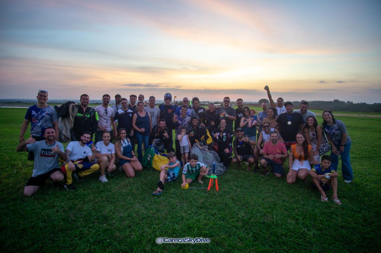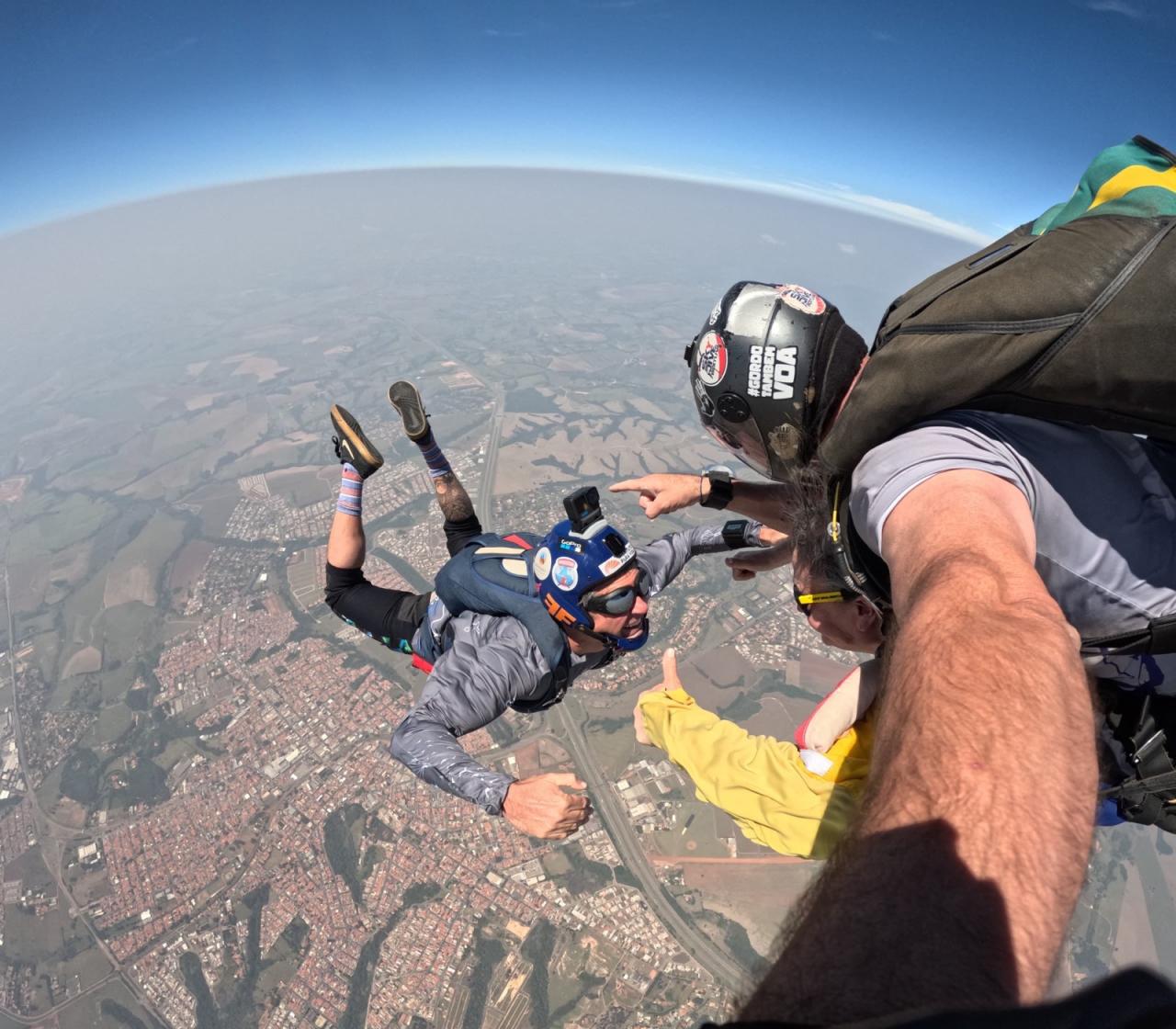 Christiano Cony: Meu primeiro salto duplo foi com o PG e o Dunguinha de câmera. Foi alucinante! Quando cheguei ao chão, queria voltar para o fim da fila e subir novamente, tipo o Enterprise ou Super Jet do Playcenter (cadê a galera "old school" para entender isso? rs). A partir desse momento, tive certeza de que faria o curso. Queria repetir essa sensação mais e mais vezes. Informei-me sobre os instrutores da São Paulo Paraquedismo e, após perceber como os processos funcionavam na escola, optei por fazer lá. Na época, também ficamos em dúvida entre lá e a PB, onde o Babu era instrutor, e como temos um grau de parentesco, isso criou uma dúvida. Mas acabamos optando pela SP.