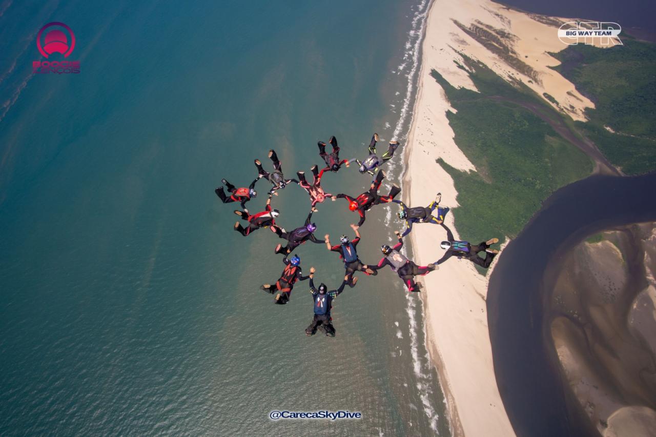 Christiano Cony: Minha sorte é que começamos juntos: eu, minha esposa (Dé) e minha irmã (Dani), e alguns amigos se juntaram a nós nesse início, como o Dieguinho, a Bia e o Pilotinho. Logo que viramos Cat B, começamos a saltar juntos. Nossos saltos sempre tinham objetivos, dificilmente subíamos só para "fazer lenha" (apesar de acontecer). Essa característica ajudou nossa evolução no esporte. Também íamos para o túnel com regularidade para treinar com o Zé. Fizemos curso de pilotagem de velame com o Cotô. Com 80 saltos, fomos convidados pelo David a começar a voar com o CTR. Fizemos o TBBF com o Marcelo Costa, treino de câmera com o Ericão e o Dunguinha, e atualmente estamos com um time de 4way, intensificando ainda mais os treinos com o RP como coach.